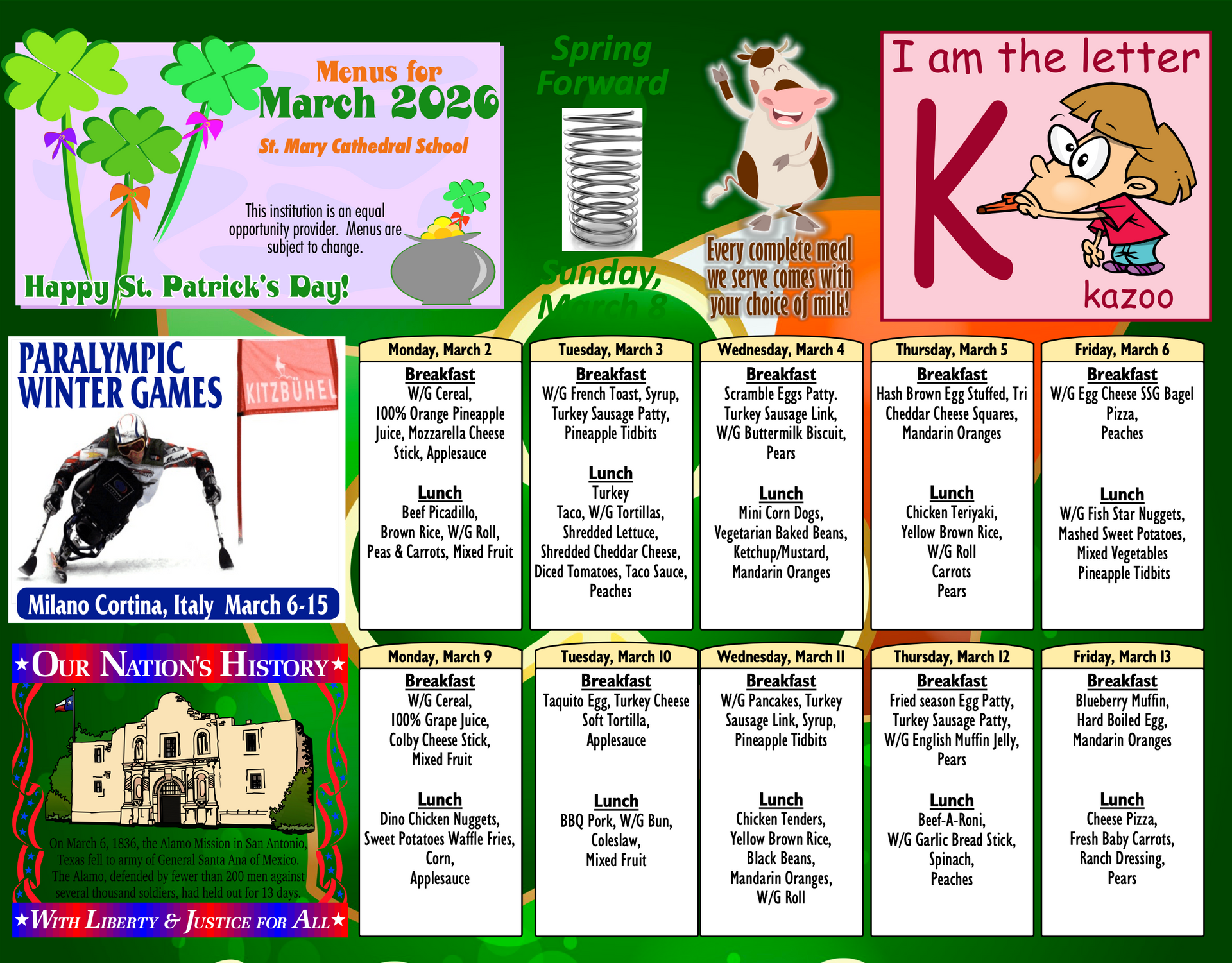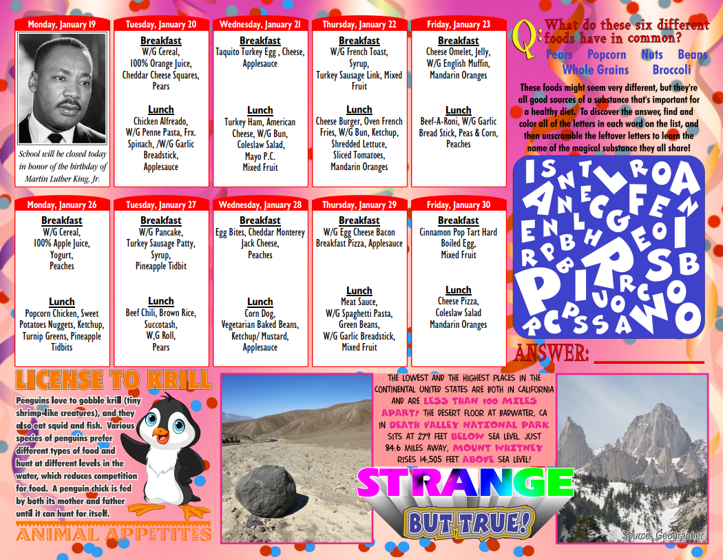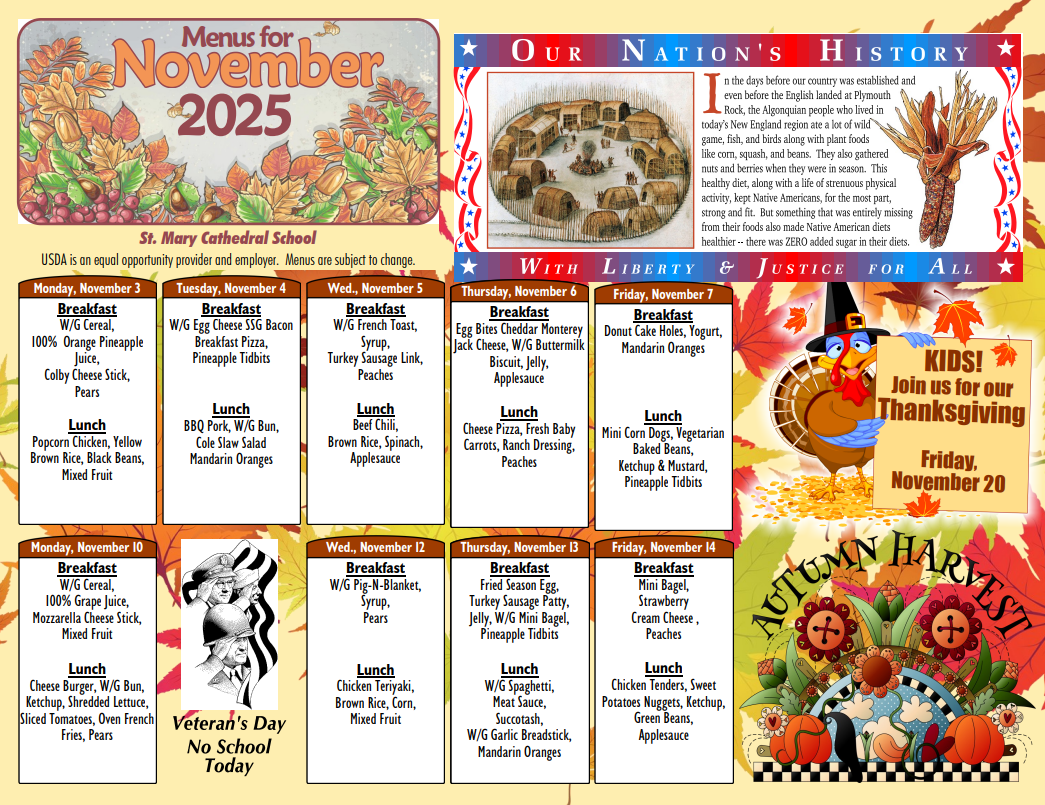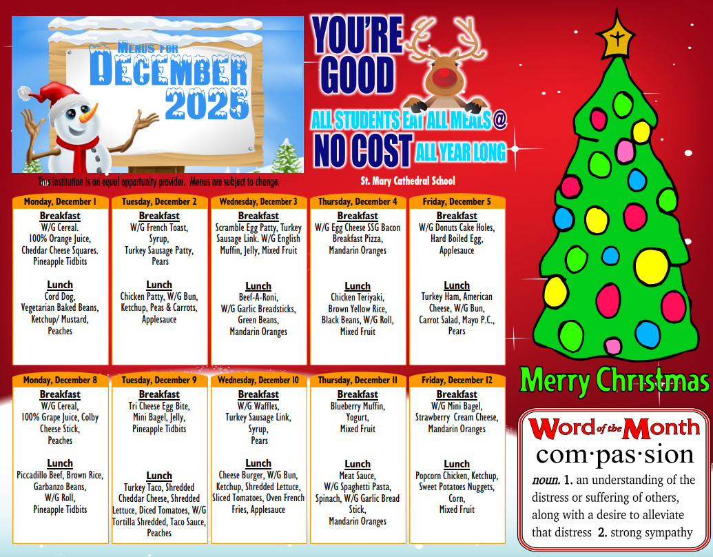 As a participant of the National School Lunch Program and the School Breakfast Program, St Mary’s Cathedral School, provides nutritionally balanced, free breakfast and lunches to our students each school day. Our meals are prepared daily on premises by our cafeteria staff.